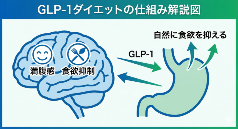GLP-1とは、もともと私たちの体内にある「痩せホルモン」の一種です。これを薬で補うことで、脳に「もう満腹だ」と錯覚させ、自然と食欲を抑えることができます。