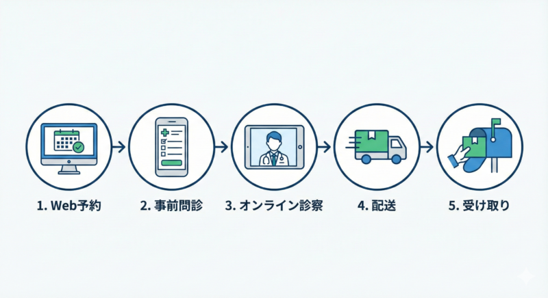 - 決済・配送: クレジットカードなどで決済すると、お薬が発送されます。