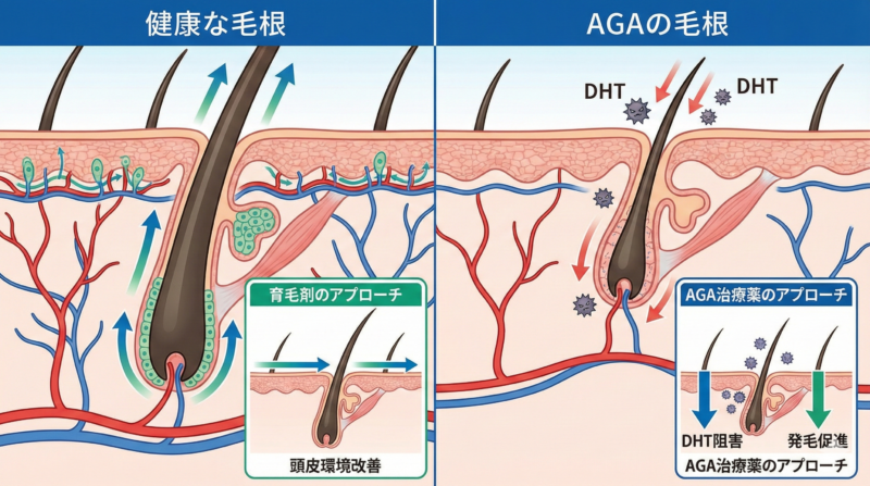 - AGA治療薬(医薬品): 進行を「止め」、新しい髪を「生やす」効果が医学的に認められている。