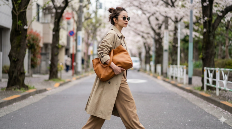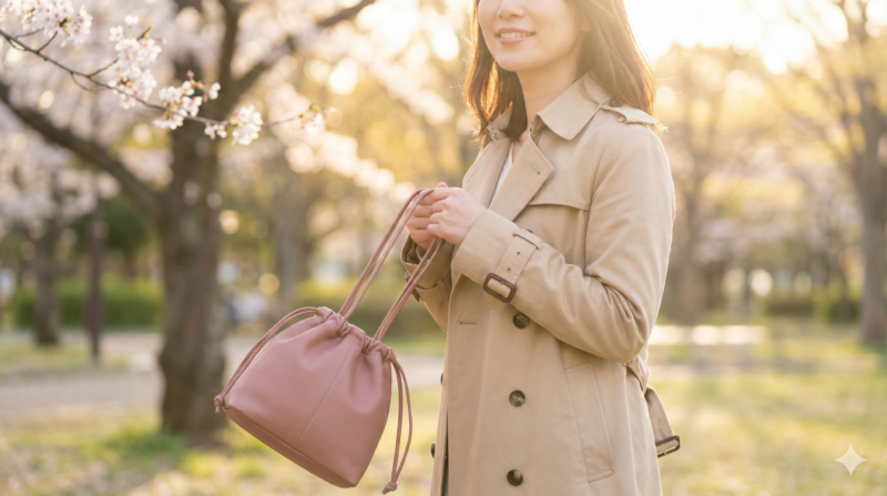 • 差し色効果: ベージュのトレンチコートにダスティピンクのバッグを合わせるだけで、一気に春の装いに。