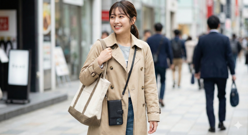 2026年のスタイルは、「ビッグバッグとの2個持ち」。メインバッグにPCやお弁当を入れ、このショルダーにスマホとカードを入れてアクセサリーのように斜めがけするのが賢いスタイルです。