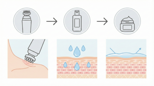 具体的な手順としては、まず洗顔後のまっさらな肌にセラムをのせ、マッサージヘッドで優しくローリングします。ここでまず針が肌に「道」を作ります。その直後にローションを重ねることで、道を通って水分やヒアルロン酸がぐんぐん吸い込まれていく感覚を味わえるはずです。仕上げのエマルジョンは、浸透した美容成分が外に逃げないようにしっかり「蓋」をする役割。この3段階の相乗効果こそが、年齢肌に不足しがちな潤いとハリを呼び戻す最強の布陣なんです。