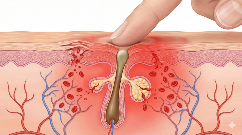 私たちの指や爪には、黄色ブドウ球菌などの常在菌が無数に存在しています。圧出によって生じた微細な傷口からこれらの細菌が侵入すると、毛嚢炎(おでき)や化膿性ニキビへと発展するリスクも跳ね上がります。