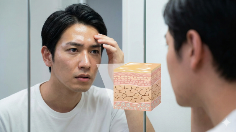 男性の肌は、女性と比較して非常に過酷な環境にあります。まず、アンドロゲン(男性ホルモン)の影響で皮脂腺が発達しており、皮脂量は女性の約2倍~3倍と言われています。その一方で、角質層の水分量は女性の半分以下(30~50%程度)しかありません。つまり、多くの日本人男性は「表面はベタベタしているのに、内部はカラカラに乾いている」という『乾燥性脂性肌(インナードライ)』の状態にあります。