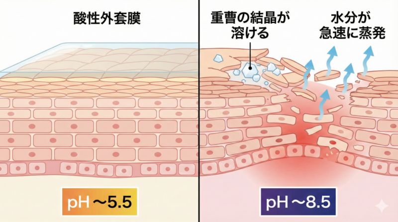 ここにpH8.2程度の弱アルカリ性を示す重曹を高濃度で乗せるとどうなるでしょうか。皮膚のpHバランス(酸外套)は一気に崩壊し、アルカリの作用によって角質のタンパク質が変性・溶解します。これは「汚れが落ちている」のではなく、「肌が溶かされている」に近い状態です。さらに、重曹の粒子は水に溶けにくく角張っているため、スクラブとして作用し、肌表面に無数の微細な傷をつけることになります。これにより、炎症、乾燥、そしてバリア機能崩壊による敏感肌化を招きます。