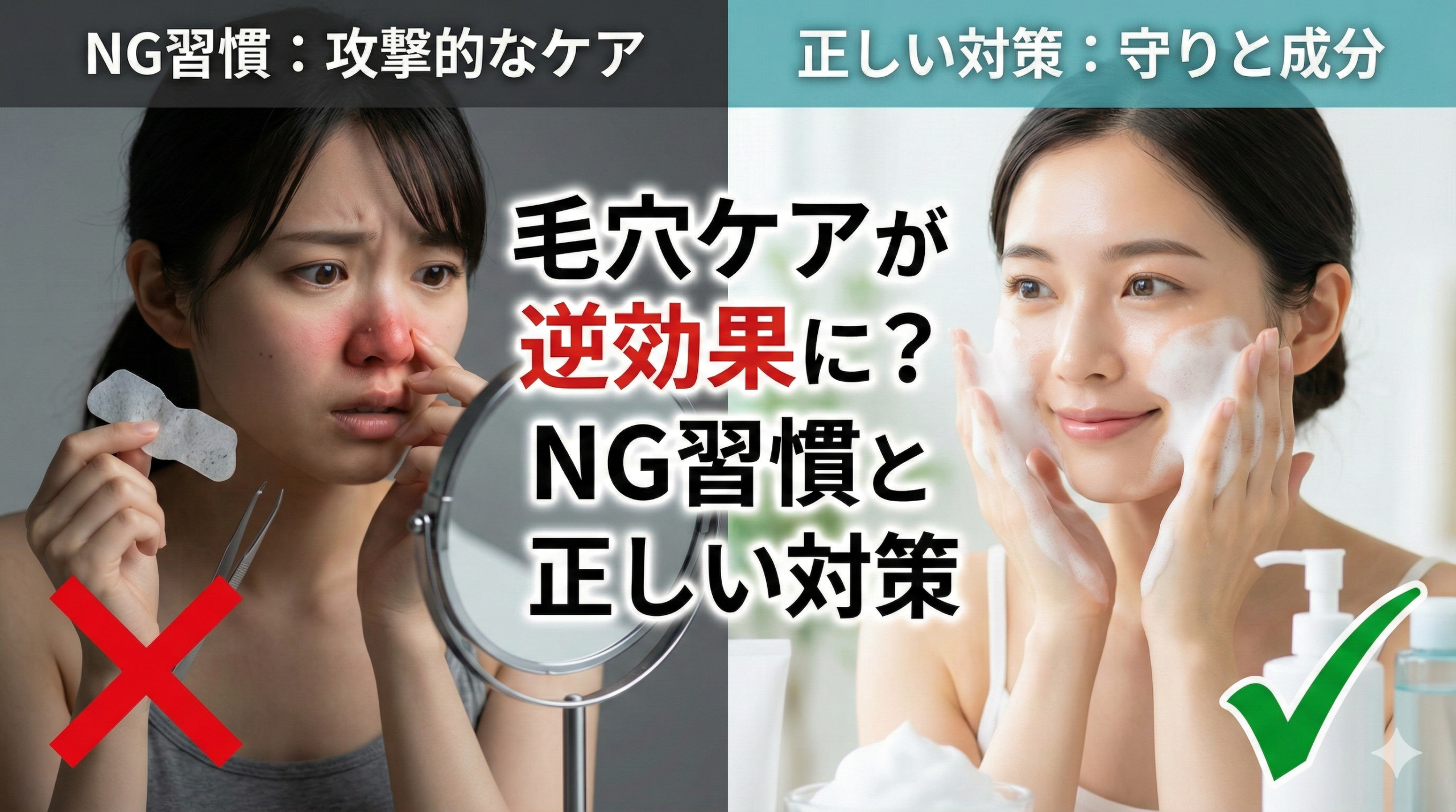 特に注意が必要なのが、「メラニン毛穴」を「角栓」だと思い込んでゴシゴシ擦ってしまうケースです。これはシミをヤスリで削っているようなもので、黒ずみを悪化させる「完全な逆効果」となります。触ってザラザラしていなければ、それは汚れではありません。美白ケアに切り替えましょう。
